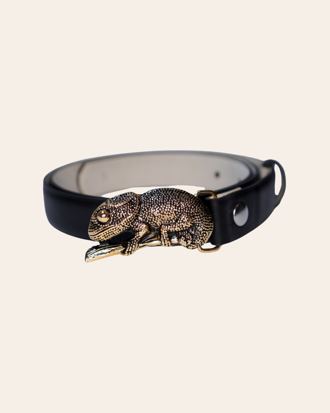 La Correa Camaleón Dorado está hecha en cuero vacuno de alta calidad con un acabado liso y elegante. Su hebilla metálica en Zamak, bañada en oro, ofrece un diseño minimalista y duradero. En el reverso, lleva un sutil grabado de nuestro logo. Con ajuste regulable y un ancho de 2.5 cm, es ideal para combinar con looks casuales o formales.